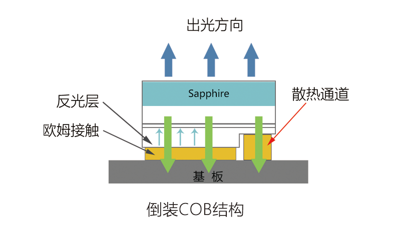 COB倒裝片技術即倒裝芯片的電極是朝下的,而且不需要正裝芯片的引線縫合焊接工藝,這樣有源層更貼近基板,縮短了熱源到基板的熱流路徑,具有較低的熱阻,可以大大提高產品穩定性。